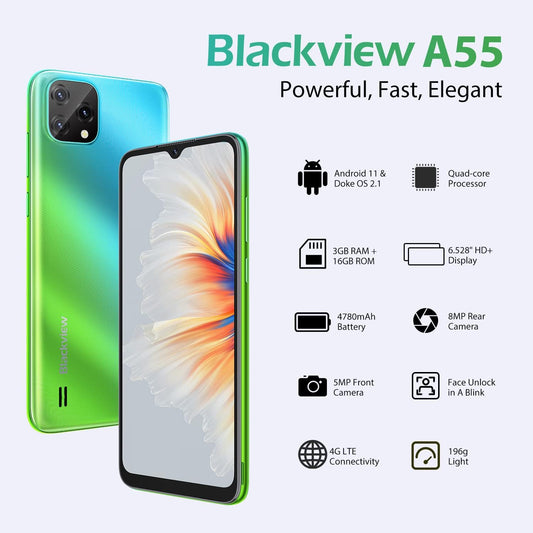 Unlocked Smartphones, A55, 2022 Unlocked Cell Phones Android 11, 6.528'' HD+,3GB RAM 16GB Rom,4780Mah High Capacity Battery,3-Card Slots,4G Dual Sim,Wi-Fi,8Mp+5Mp,Face Id,T-Mobile Phone,Black